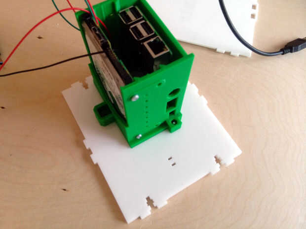 Utilizando cuatro tornillos M2.5 y tuercas, montar la frambuesa pi a la interna del chasis. El borde de la pi con los conectores debe ir hacia la parte superior de la lámpara.