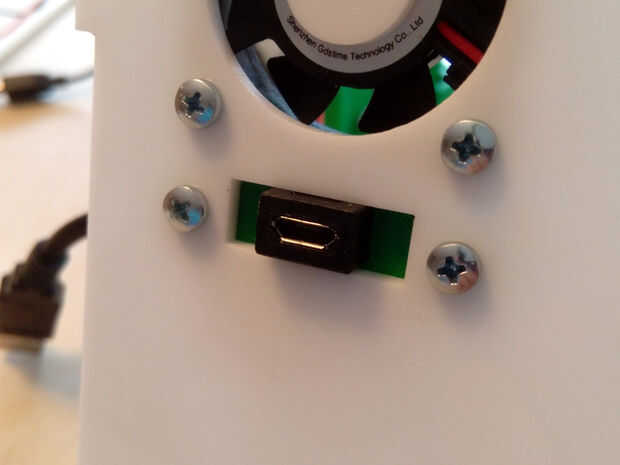 Coloque el que conector de alimentación de pidrive en el segundo 3D impreso pieza. Si usas el Sabrant IDE a USB adaptador de disco duro, utiliza el otro adaptador de montaje de panel 3D impreso para montar el conector de alimentación molex de 4 pines. En cualquier caso, después rosque dos tornillos de M3x14mm a través de los agujeros en la parte exterior de la parte posterior del panel y fije el soporte de conector de alimentación.