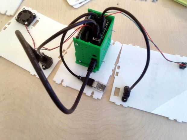 Fijar los paneles frontales y posterior en la mesa de al lado del panel inferior para que puedan conectar los cables internos a la frambuesa Pi.