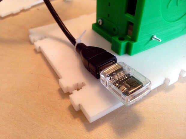 Conecte el cable de extensión USB. Use una atadura a través de las ranuras siempre en la parte inferior de la caja para fijar el cable para que el conector hembra apunte hacia la parte delantera de la caja como se muestra.