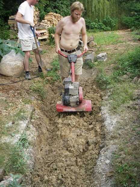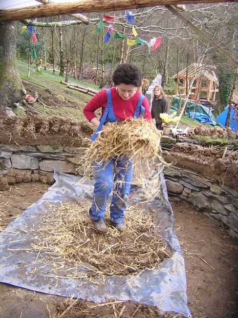 Hay varias maneras de mezclar barro y fibra. Prefiero hacerlo con un motocultor de labranza del suelo agregando agua y fibra y labranza para formar un lodo espeso. También puede hacerlo con los pies, o puede poner el barro en una lona pequeña y mezclar el suelo, el agua y la fibra con los pies y rodar el barro tirando del borde de la lona para poner el suelo seco sobre barro húmedo.