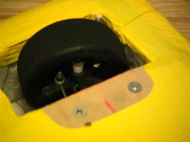 Tomé entonces un trozo de alambre de piano que afilar y asomó un túnel a través de la espuma de la rueda de manejo para el cuerno del servo. Amplié el agujero un poco más con una varilla de pasador. Este túnel es para el acoplamiento. Midió la distancia desde el centro de servo para conexión de punto en la rueda y luego unas pulgadas extras. Había doblado una 1/2"'L' en el extremo del alambre. He insertado el cable en el túnel con la 'L' en el servo. La 'L' está conectada con el cuerno del servo y sujeta con un collar de rueda.