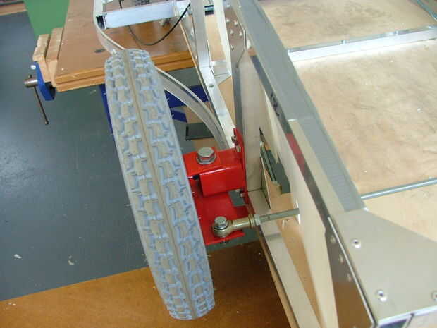 Las ruedas delanteras tienen un rey acero suave simple doblado 2 mm perno arreglo con un perno de 19 mm para el rey pin. Con un montón de grasa, que esto funciona bien. las barras de dirección tienen extremos trackrod fácilmente disponibles de proveedores para permitir que cierta elasticidad en el sistema de ninguna alineación complicada era necesaria sólo fija las ruedas recto del cojinete.