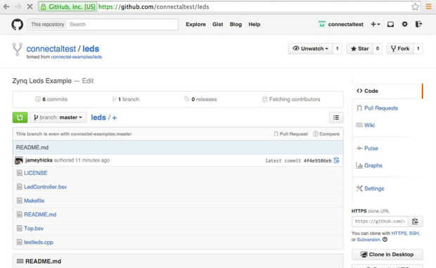 Ahora que tiene su propio repositorio personal por ejemplo, puede modificar la aplicación. Haga clic en el enlace testleds.cpp para que usted puede editar el archivo.