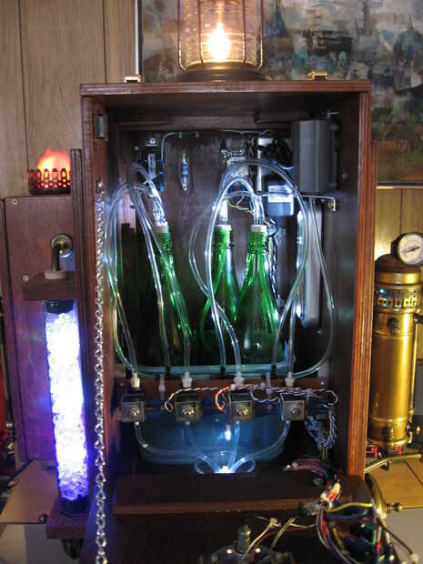 Montado en el interior son también las válvulas de solenoide. Estos funcionan con 12 voltios y son normalmente cerrados cuando no se aplica la energía. Después de haber seleccionado una bebida, el operador presiona el botón de inicio. La bomba de aire comienza y presuriza las botellas. Luego el Picaxe abre una válvula para una cantidad de tiempo liberar el contenido en el vaso. Cada bebida es una secuencia de operaciones tiempo de las válvulas. Una bebida completa tarda 20 segundos en dispensar. Medí una precisión de alrededor del 3% en la consistencia de cada bebida. Al llenar las botellas, no llene la parte superior. Relleno a sobre fueron el comienzo de la curva. Esto mantiene constante la superficie. Flujo es una función de área superficial y presión.