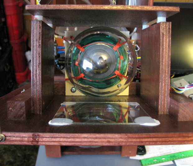 he añadido una esfera de plasma (video) para darle ese look Si-Fi. Yo tengo la mía de la ciencia y los excedentes para menos $18 dólares. Incluso compré un extra cuando estaba a la venta. La esfera está montada sobre un pequeño soporte de madera colocado detrás de un agujero de 3 pulgadas aburrido en la puerta de la caja.  Coloqué una lámina de vidrio entre la esfera y el orificio para protegerlo de gente tocar el globo. Estas cosas siempre atraen a la gente para tocar y dejar huellas. El cristal era de un marco de cuadro comprado en una tienda y fijadas a la madera con masilla.