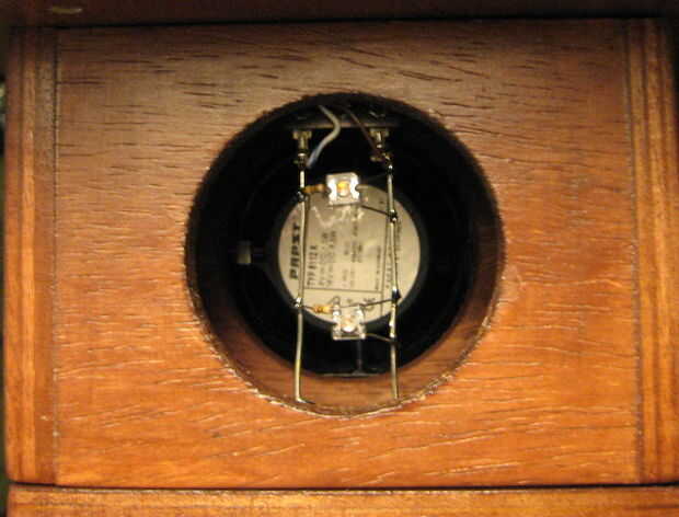 Dos leds rojos ultrabrillantes de "Piraña" se utilizan para proyectar la luz roja en la llama de tela.  Mejor es una tela ligera como la seda. No tener seda, usé a algunos poliéster ligero. Un fan de CC de 12 voltios solo hace que la corriente de aire.