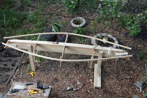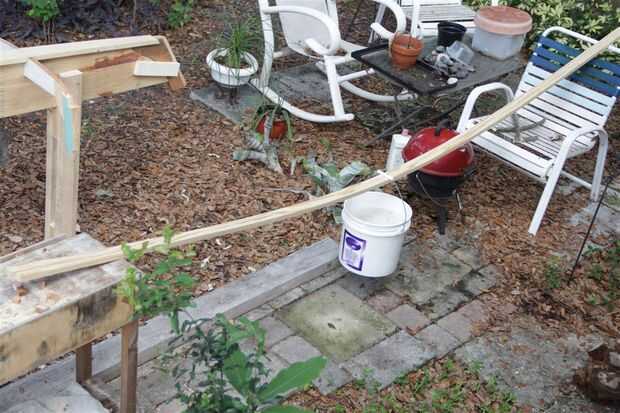 El marco del centro es en realidad parte de la forma y no está atado a la embarcación, dotándola de una cabina abierta entre los cuadros #1 y #3. Muesca en las piezas de tallo y me adjunta al formulario con un par de trozos de capas en cada lado. Luego que la quilla a la longitud y el iniciado en los lomos. Pino amarillo del sur es una madera muy fuerte y estos son 3/4 x 1 3/8, así que puso los pedazos entre mi banco y silla y cuelga un cubo de arena sobre ellos para poner algunos pre bend en la madera. Esto funcionó como un encanto. el cubo fue un buen 8" de la tierra cuando yo colgado primero allí. Por la mañana estaba en el suelo.