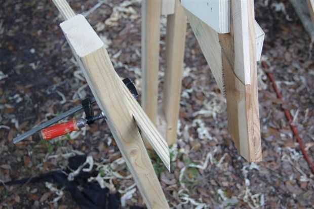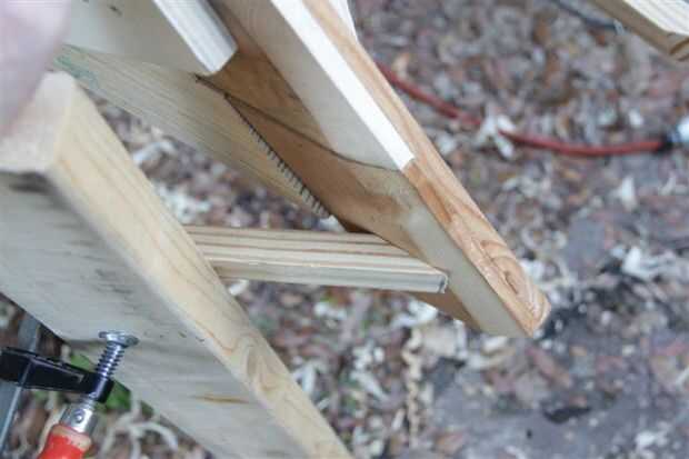 En el proceso de agregar estos componentes representé una mejor manera de cortar los extremos. Mucho de esto es hecho a ojo, pero he encontrado que pude Fije la abrazadera (lo siento) un 2 x 4 y utilizarlo como palanca para mantener la pieza en su lugar y marque la parte superior e inferior, entonces conecte las líneas para obtener mi línea de corte. Compruebe las imágenes pueden mostrarlo mejor de lo que estoy haciendo aquí.