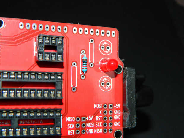 Ahora para el azul y el verde, es la llamada, el LED, superior donde tenemos verde va a ser los latidos del corazón LED. La parte inferior uno parpadea alegremente las fichas se están programando. Estos muchachos en la soldadura, así como las resistencias y clip de las piernas, protegiendo los ojos una vez más.