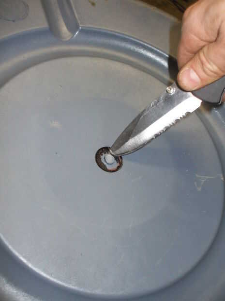 Luego, retire el forro y utilice un par de tijeras o similar (como en la foto) para recortar el exceso de línea. Ahora, vuelva a instalar temporalmente como una prueba de ajuste otra vez encima de su soporte inferior, para el revestimiento si al ras con la parte superior de su casco de lavadora.