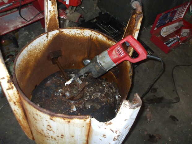 Luego, voltee la unidad (como se ve en las fotos abajo) y retire los conjuntos de bomba de impulsión de agitador. Pude conseguir algunos tornillos flojos usando sockets de artesano y WD40... pero el sawzall tuvo que salir para las partes difíciles, oxidadas.