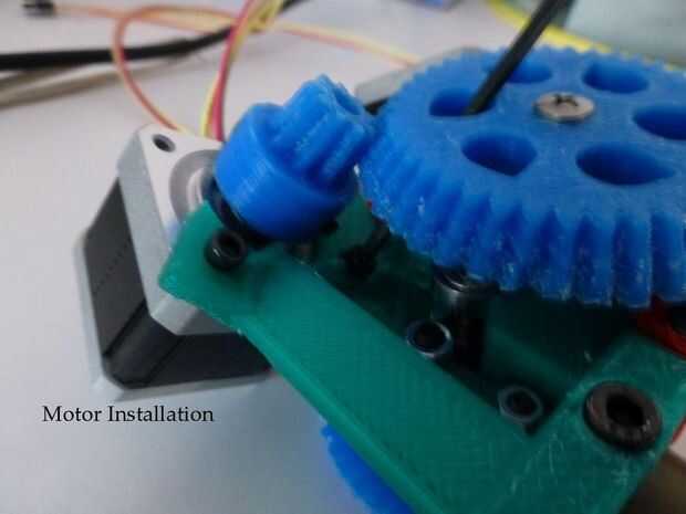 Use tres tornillos de M3x10 para montar el motor. El perno inferior es accesible a través de los agujeros en el engranaje grande. Ver imagen titulada "Instalación del Motor".