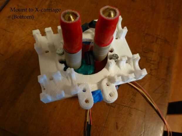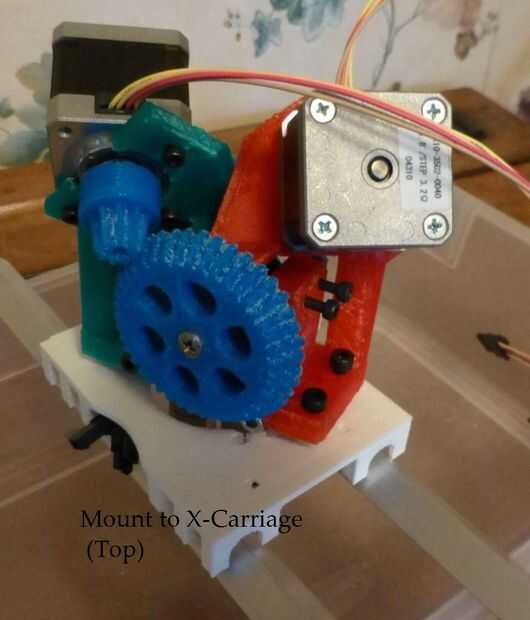 El estirador doble de montaje requiere cierta ingenuidad de tu parte ya que no hay estándar del diseño para un carro X llevar este estirador. Dicho esto, sólo debe tomar pequeños cambios para modificar cualquier carro X dado. Una Dremel podía hacerlo, o una pequeña revisión a un diseño ya existente de carro en Thingiverse. Si crea un diseño de carro modificado a sí mismo, considere publicar en Thingiverse.