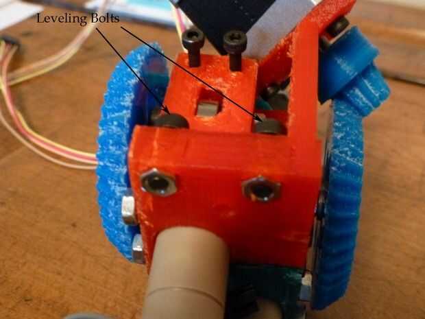 Los pernos pueden insertarse en las tuercas en los bolsillos en los extremos de la base a nivel de las boquillas. Las puntas de la boquilla deben estar muy cerca de nivel (es decir, la misma altura de la cama) evitar arrastrar la punta baja en una parte que se imprime. Refiera al cuadro titulado "pernos de nivelación".
