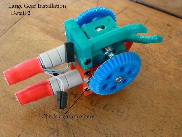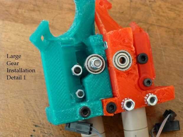 No te preocupes si el cojinete en el lado "abierto" parece suelto, se te todos a cabo en lugar por el tensor cuando se aprieta. Compruebe la separación del engranaje grande para el cuerpo de la extrusora. Asegúrese de que los extremos del perno no rocen el engranaje que gira. Si es así, solucionarlo ahora. No hay mejor más adelante. Ver imagen titulada "gran detalle de instalación de equipo 2".