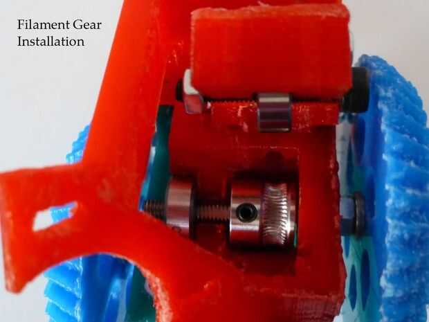 Centro de la unidad de filamento de engranajes en el orificio del filamento, línea el conjunto de cagarla con el plano baja sobre el eje y apriete el tornillo de ajuste. Utilice una gota de Loctite en el tornillo de ajuste para mayor seguridad. Ver imagen titulada "instalación de equipo de filamento".