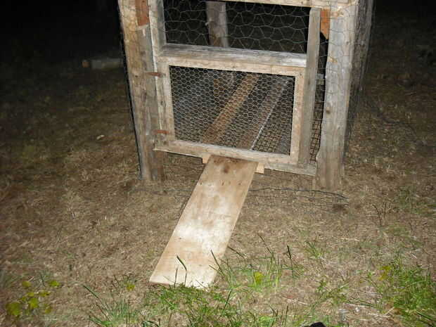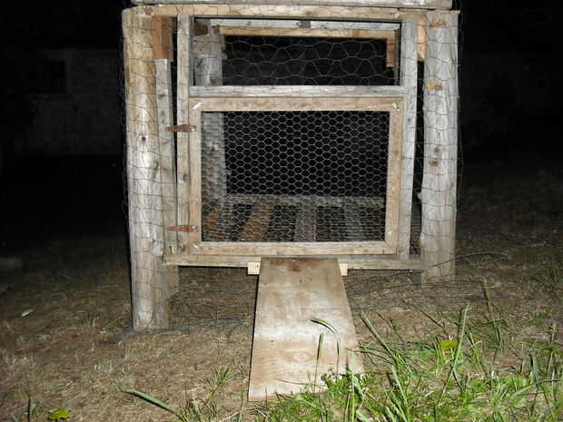 -Usando un viejo trozo de madera tornillo en una rampa por debajo de la puerta para que los pollos pueden caminar dentro y fuera de la cooperativa.