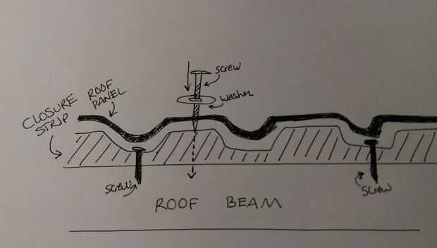 Las tiras de cierre van a lo largo de la parte delantera y vigas del techo trasero, enroscadas en el haz de cada par de "valles" con tornillos de 1.5".
