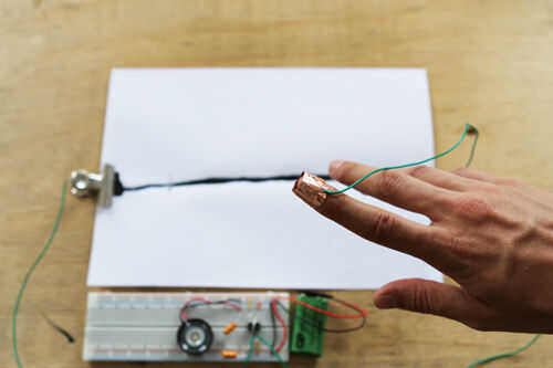 Tome el cable de pinza bulldog y coloque en su plato de conexión al comienzo de la línea que pintado anteriormente. A continuación tome el cable slider y correr a lo largo de la línea de pintado. Moviendo el control deslizante a través de la línea de pintado puede variar la frecuencia del sonido que sale de los altavoces! Si tienes alguna mentira de cinta de cobre alrededor de usted puede pegar el metal expuesto de su alambre deslizante sobre el dedo para una interacción más natural con la pintura.