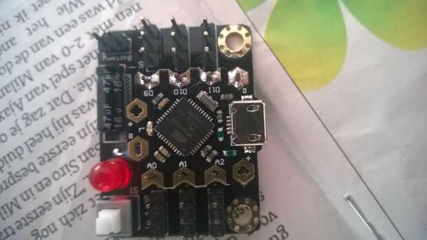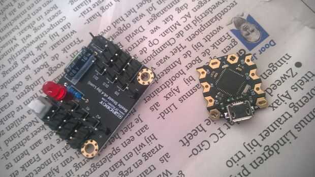 La primera en la fabricación de la insectbot, es el escudo de escarabajo a la placa de circuito del escarabajo de la soldadura. Simplemente coloque el protector en la parte superior la placa de circuito y soldarlos juntos. Ser duro cuidado: Asegúrese de que usted les alinean de la manera correcta. Deben coincidir con los números, y así si los polos positivo y negativo.