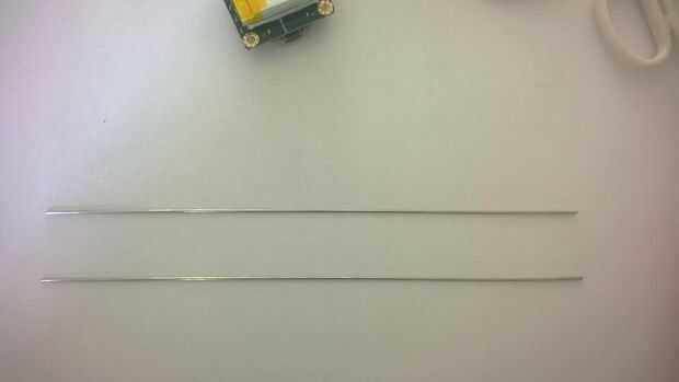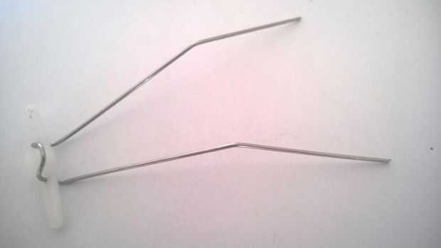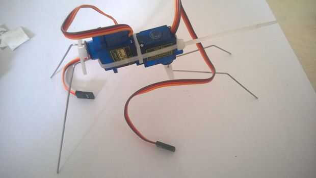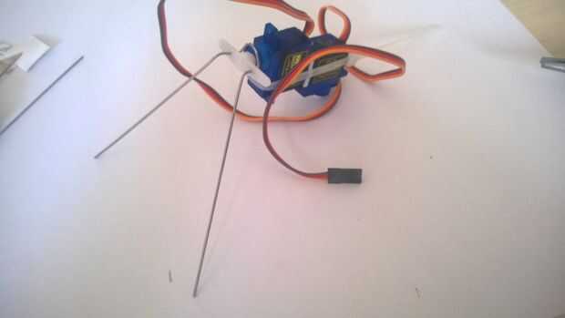 Tiempo para el paso numero 3; hacer las patas. Para este paso, usted necesitará los dos cables de acero y dos rotores de plástico que vienen con el servo.
