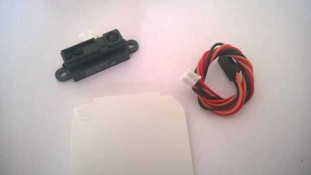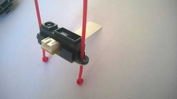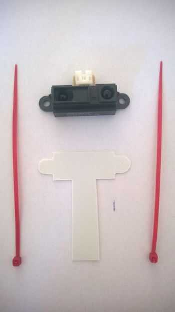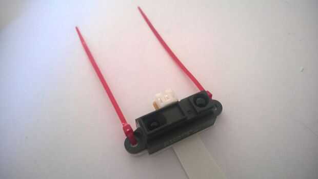 Para empezar a hacer la cabeza del robot y sus ojos, usted necesitará el sensor de infrarrojos, la hoja del ABS, dos lazos del cierre relámpago corto (rojo) y un tornillo.