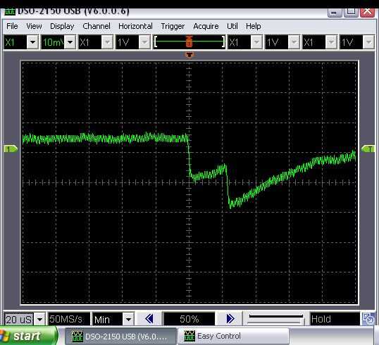 Por ahora, os dejo con la lectura de un ámbito de megasamples/s Hantek DSO-2150 USB 150, que ha sido amplificado mediante un amplificador diferencial basado en la OPA 2132... Muestra el impacto de 1 o 2 núcleos de helio a ~ 5MeV, superpuestas. Tenga en cuenta cómo producen picos de la amplitud del mismo, lo que sugiere dos partículas de similar energía golpea el detector. También es posible (remotamente) que una partícula tenía una colisión elástica y luego golpea otro átomo de silicio en el detector una segunda vez dentro de 20 microsegundos, o que hubo algún tipo de emisión secundaria, pero en este caso se espera que sea poco probable debido a que los dos picos tienen amplitud similar.