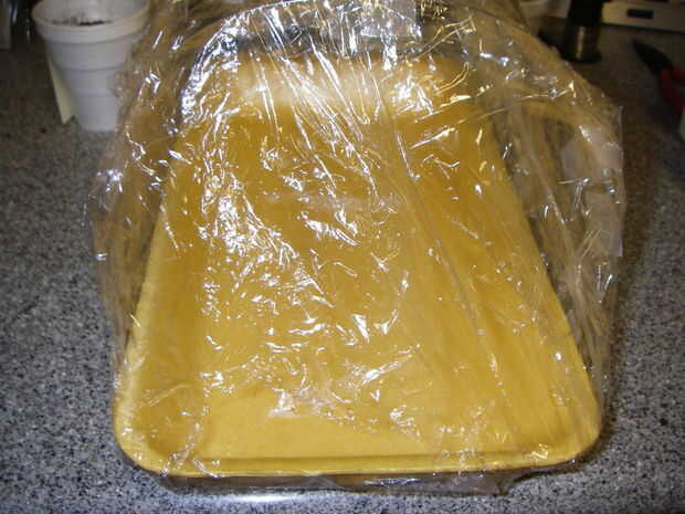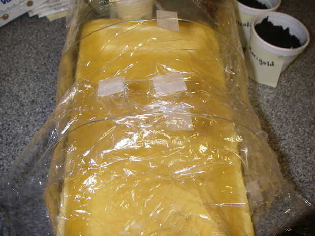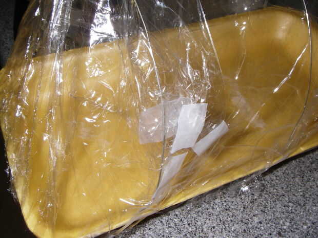 La envoltura de plástico alrededor del arco de la cinta. Además, la cinta al final de la deformación plástica en el borde de la bandeja.
