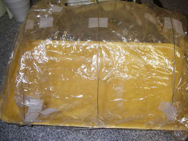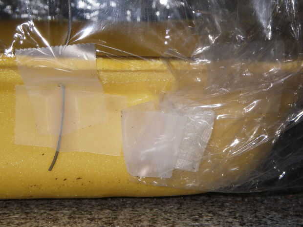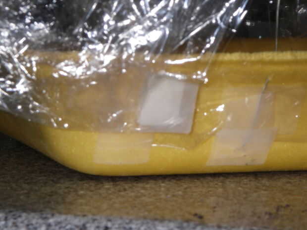 Tomar una pieza de Velcro y pega una parte de ella a la esquina de la bandeja. Adjuntar la correspondiente pieza de Velcro en la esquina correspondiente de la envoltura plástica. Asegúrese de que si le colocas las 2 piezas de Velcro juntos, pueden alcanzar. Repita con el otro lado.