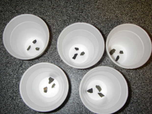 a continuación, voltear las copas alrededor y añadir pequeñas rocas a los agujeros. Esto se hace para que el agua puede escurrir pero no demasiado (tiene que filtrarse por debajo de las rocas).