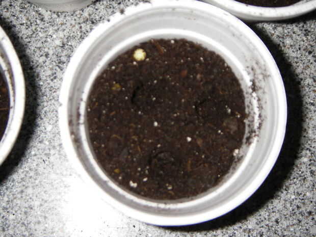 Utilice sus dedos para meter 3 agujeros en el suelo por cada taza. El dedo debe ir unos 2cm de profundidad en el suelo. Estos agujeros son donde irán las semillas.