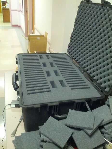 Cuando corte la pick N' desplumar espuma algo larga, fino y aburrido como la parte de atrás de una larga sierra hoja funciona muy bien para separar la espuma. La espalda sorda le permite separar la espuma precortada sin añadir cualquier nuevo corte que no desea. Asegúrate de ir despacio y use un marcador para marcar apagado donde cada corte debe ser hecho. Espuma más gruesa puede ser una opción mejor pero requiere moldeo personalizado.