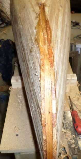 Una vez que el casco es totalmente despojado es hora de cortar las tiras con los tallos de proa y popa. El vástago externo entonces es empotrado en la parte inferior del casco y pegado al vástago interno con epoxi espesado. Tornillos recubiertos con cera se utiliza para sujetar el vástago externo en lugar. Se eliminará cuando se pone el pegamento y los agujeros va a ser conectados.
