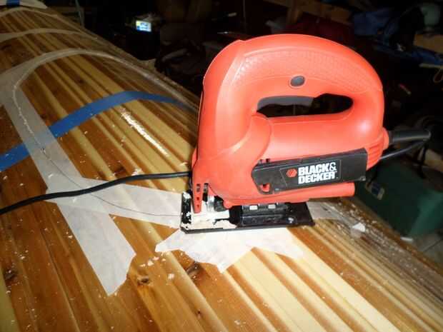 Una vez que se trazó el contorno en la cubierta comencé el corte con un cuchillo y acabado con una sierra de calar. Utilicé tres capas de madera contrachapada exterior de 1/4 de pulgada para el espacio entre la cubierta y el borde del hoyo polla. el separador s eran cada corte en dos pedazos corriendo verticalmente pegada y fijada a la cubierta alrededor de la abertura de la cabina.