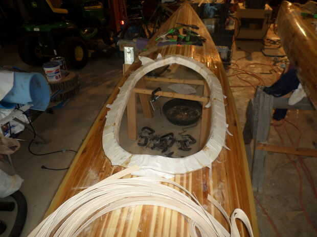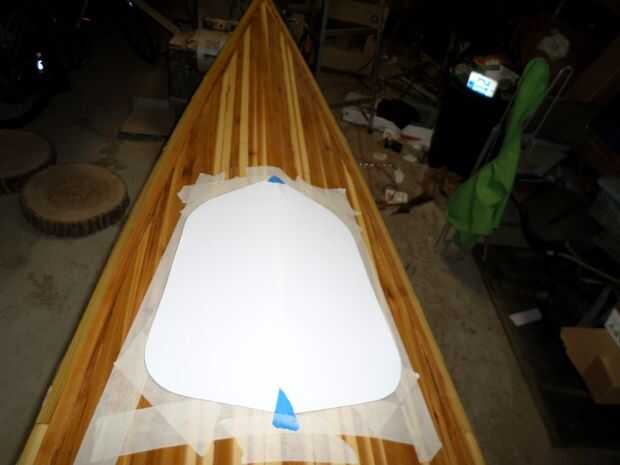 Ahora es tiempo de cortar el agujero en la cubierta hermosa. Corte un huevo en forma de agujero de la cabina que era aproximadamente de 29 pulgadas de largo y 18 pulgadas de ancho. Me encontrado un diagrama de una forma en línea y agrandado que luego imprime en 8-1/2 X 11 hojas luego los juntar. Esto fue trazado sobre cartulina luego pegada al casco por lo que su centro fue a popa del centro de la embarcación.