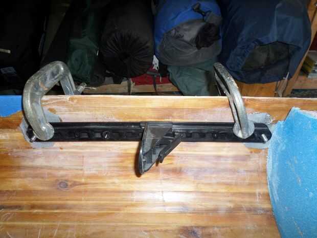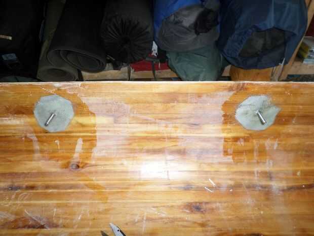 Llaves de pie son pedales en el interior las paredes de los kayak y ayuda añadir estabilidad cuando navegues. Usted puede hacer su propio conjunto ajustable si eres inteligente, pero comprar mina de Wal-Mart en línea para cerca de $20. El pie soporte abrazaderas fueron Unidos usando el pegamento en postes de madera, que son sólo 1/4-20 postes de madera con una placa plana perforada para una cabeza. Los postes fueron pegados con epoxi espesado y reprimieron a las paredes laterales cerca de 3 pulgadas desde el borde superior del casco inferior y nivelados por el ojo con una tira. Después de que el epoxi instalación 2 capas sobre un cuadrado de 3 pulgadas (o ronda) parche de tela de fibra de vidrio se ajustaron sobre la cabeza de cada perno para dar soporte.