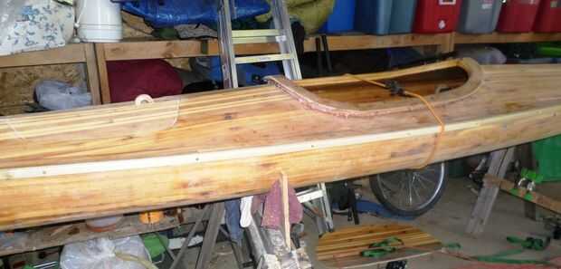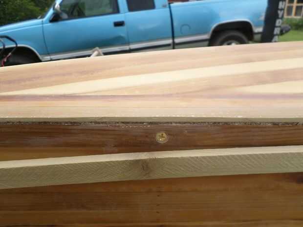 La articulación donde la cubierta con el casco inferior debe cubrirse para mantener agua firmemente y también para cubrir la cabeza del tornillo. Usé un 3/8" de espesor por 3/4 cinta ancha de álamo que era dos bufanda de longitudes de 10 pies se unieron. Esta pieza de adorno se une con epoxi espesado y #6 1 pulgada plana cabeza de los tornillos de latón. También eran empotrable de 1/8" y cubiertas con un trozo de barra de pasador que se pega con Titebond III.