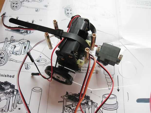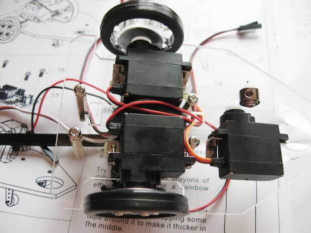 Mientras el robot está al revés, ahora es un buen momento para alimentar los cables motor y servo a través del orificio en la parte delantera si no lo ha hecho ya. Hay un agujero libre en la parte posterior en caso de que desee agregar otros sensores en el futuro.