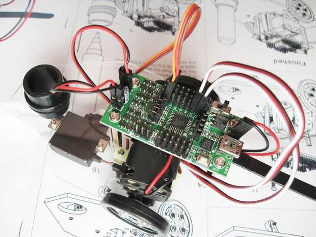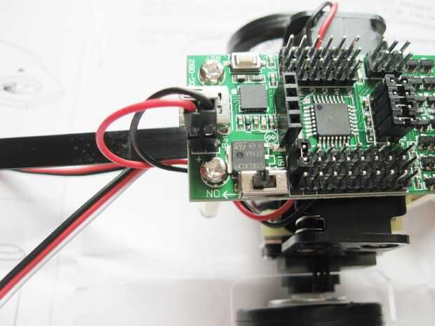 Ahora Conecte sus sensores de encoder de la rueda y el servo. Tenga en cuenta que el cable negro/marrón va siempre hacia el exterior del PCB. El cable blanco o amarillo es siempre más cercano al procesador.