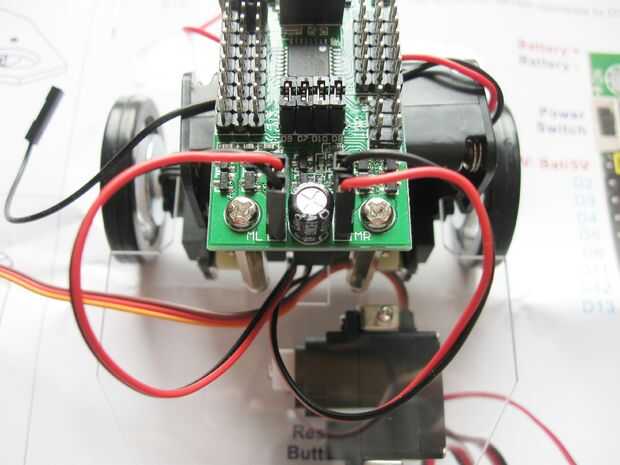 Conecte el motor adecuado a la salida de "Señor" y el motor izquierdo a la salida de "ML". Prestar especial atención al color de los cables. Cuando el robot ejecuta el código de ejemplo, el primer paso que debe hacer es viajar adelante a corta distancia, luego y gire hacia la izquierda.
