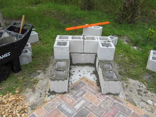 Bloques de cemento son los mejores materiales para construir la base. Son fuertes, barato y grande = menos rejuntado que los ladrillos mucho más pequeño. El tamaño más común de bloques de cemento en los Estados Unidos es 16 x 8 x 8. Recomendamos una altura de 40"- 44" la superficie de cocción, esto hará que tus bloques base 4 o 5 bloques de alto.