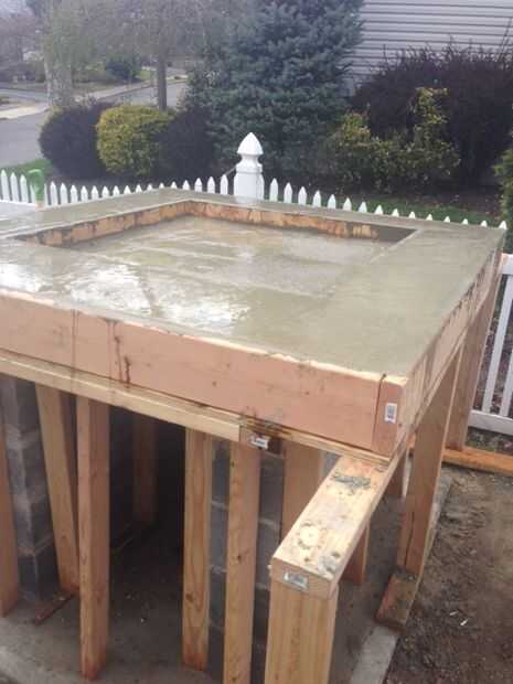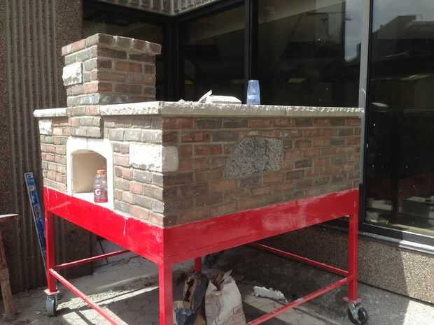 Coloque una hoja de acero en la parte superior las 3 paredes de la base. Generalmente puede comprar uno de un fabricante local de metal. Tiene que ser grado suficiente para soportar el peso del horno + la chapa. Se puede utilizar una combinación de 2 hojas de lado a lado, por ejemplo dos 30 "x 55" hojas para una superficie de 60 "x 55". Esto hará más fácil de ofrecer y manejar. No tienen que fijarse a la base - el peso del horno mantienen firmemente en su lugar. En la parte superior del tablero del cemento de lugar metal (por ejemplo Durock). Se trata de media pulgada de espesor, hacer 8 capas de un grosor de cemento total 4". Eso es todo, su superficie se construye. Esta es la manera más rápida y más fácil que el proceso se describe a continuación. Se puede ver un soporte de metal de hoja para un horno que construyó en el patio de un bar (uno rojo).