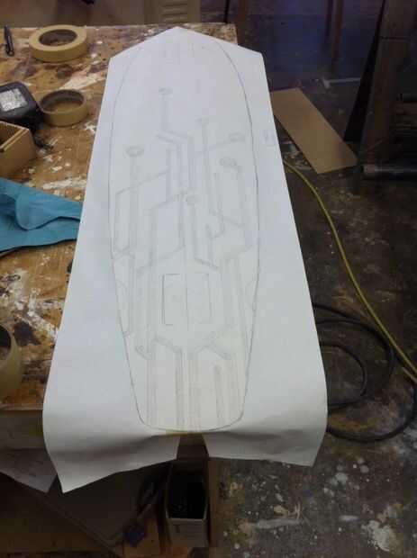 Una de las primeras cosas que hice fue el patrón para la parte inferior del tablero de diseño. Estaba entusiasmado con estos diseños de placa de circuito que había descubierto, y tiré juntos algunos conceptual muy colorido en Photoshop. Cuando me puse a hacer un patrón de escala completa terminé sólo utilizando el concepto de arte como inspiración y libre-que da el diseño. En el proceso de planificación, también tenía que pensar en la forma que la Junta que tuvo que ser laminado, lo cual nos lleva a la forma.