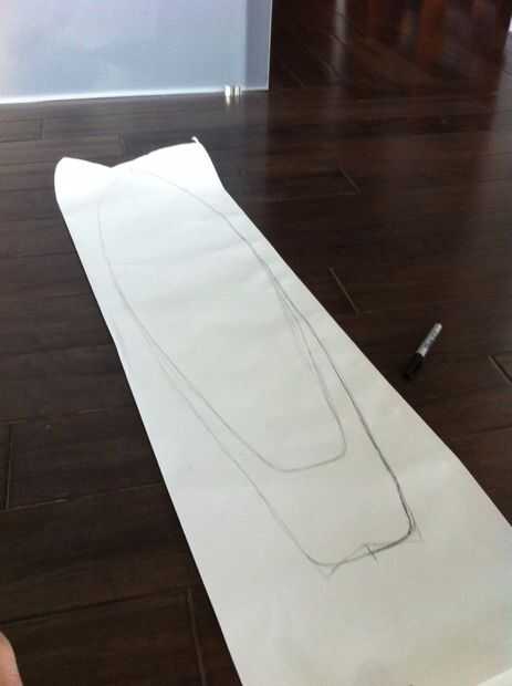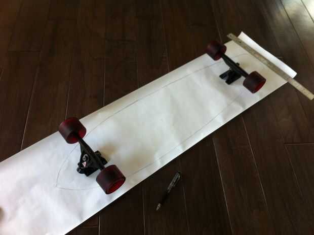 Longboards vienen en todo tipo de formas. Puesto que el propósito de esta junta era sólo diversión y transporte no intenso, fui con una forma de estilo cruiser. Tuve suerte de tener a un amigo que tenía un tablero similar al que había imaginado, así que tomó un trazo del contorno y apenas modificada un poco para conseguir mi forma final. La Junta terminó aproximadamente 9" en el punto más ancho y 37" de largo. Con paciencia se puede a mano alzada la forma, pero un tablero de modelo es muy útil para tener una idea de lo que quieres.