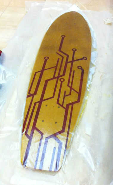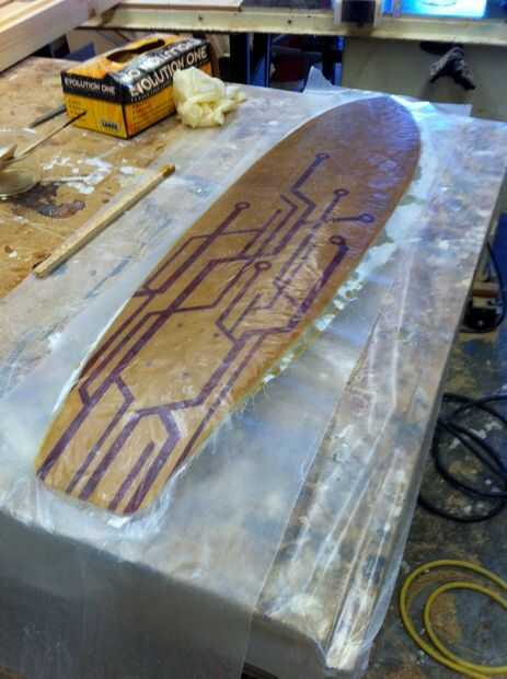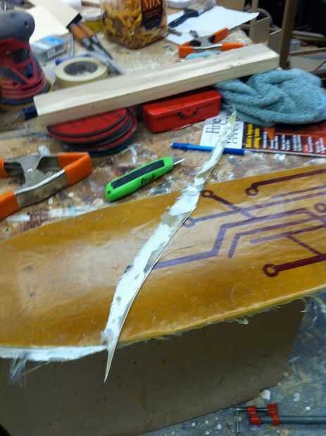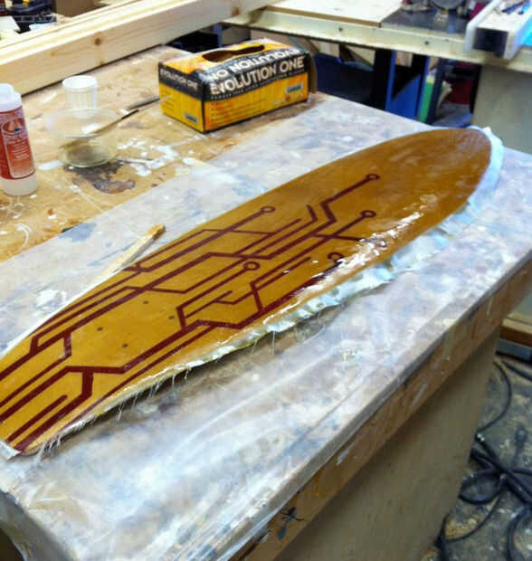 Aplicamos una última capa de fibra de vidrio en la parte inferior para protección y ofrecer algo a polaco. En el proceso de pulido (que viene más adelante) desea que la superficie a ser lo más plana y suave posible. Nuestra solución fue en epoxy extra un poco y luego estirar un pedazo de papel de cera sobre toda la superficie. Después de dar a esto un día más o menos a curar hasta quita el papel encerado, corte el exceso de fibra de vidrio con una maquinilla de afeitar y lijar al ras con los bordes. Ahora para la parte superior :)