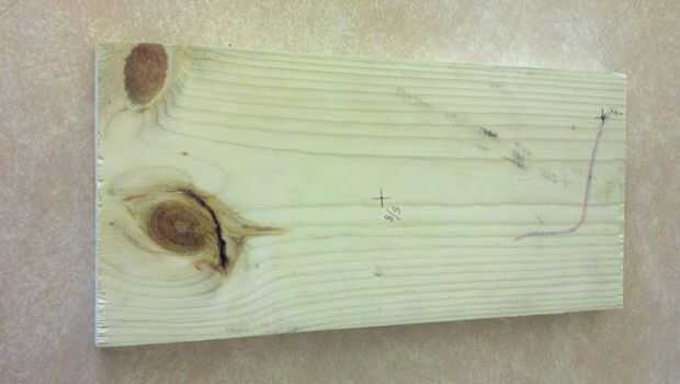 A continuación, marque las ubicaciones de los agujeros en las secciones de 1ft. Mi primer agujero que marcó fue el pasador de 5/8" más grande. Marqué en el centro de la madera y de aproximadamente 6 pulgadas de la bottm. Digo aproximadamente porque mi cinta métrica es que falta y realmente sólo comentar el agujero. Este agujero se coloca alta que cuando el carrete de alambre está en la espiga, la bobina estará clara de la parte inferior del mandril.