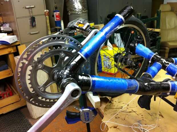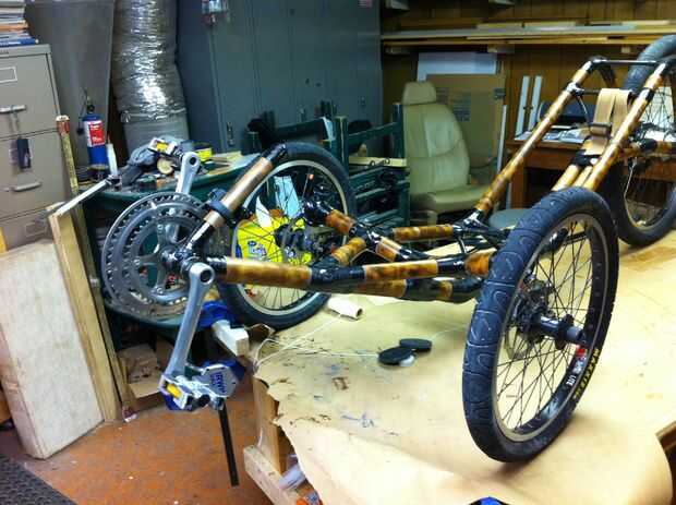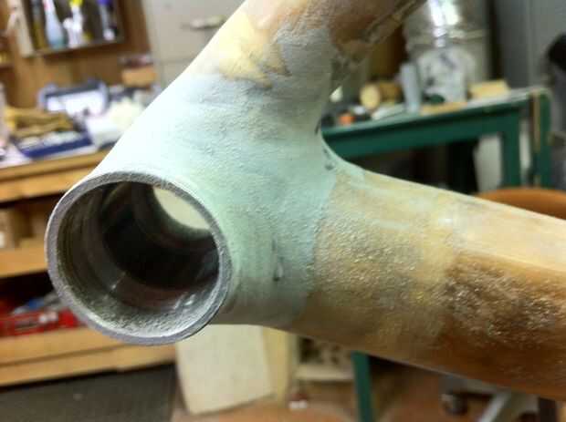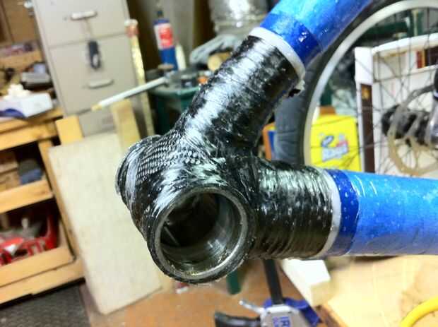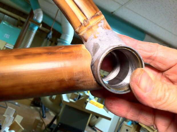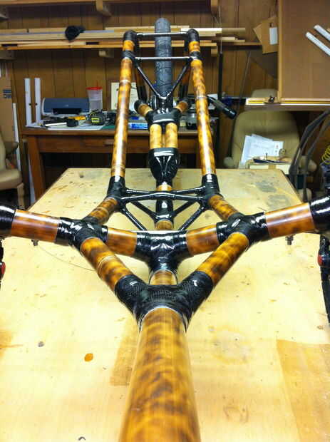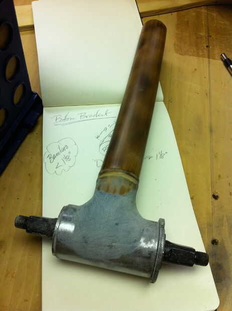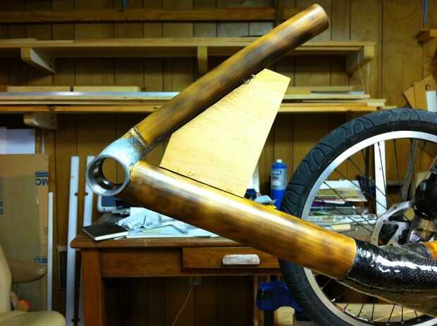 Uno de los defectos de este diseño es que se hace para un solo pasajero de una cierta altura ya que no hay ningún ajuste para el asiento. Desde que soy 48 y haya completado mi crecimiento de huesos largos esto no es un problema;) Fabricantes de Trike resuelven este problema usando un auge delantero telescópico que puede ser trato en mi próxima construcción. Usted necesitará saber donde usted quiere el BB y pedales y hacer una boca de pescado cortada en el brazo principal (Fig 5). Esta parte es un poco complicado ya que desea que el BB nivel horizontalmente, escuadra con la pluma y el bambú cambio a 70° c a la pluma principal. Toma un poco de jugar con él para tenerlo cerca, pero nunca lo consiguió perfectamente equipadas. La imagen se ve mejor de lo que realmente era. Una vez más usé pegamento para mantenerlo una vez que lo conseguí en el lugar correcto y luego doble revisar todo. Si no es correcta, conseguir la pistola de calor para derretir el pegamento y sigue intentando hasta que estés feliz. He encontrado que realmente útil disponer de un bloque de corte de 70° y caliente pegado a la pluma principal (foto 6). Una vez caliente pegado en su lugar, aplica y esculpido el epoxi alrededor de la articulación con las copas en la BB para mantener la hilos limpia (foto 7).