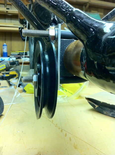 www.mcmastercarr.com es un recurso de hardware fabuloso para cualquier proyecto. Después de un poco, he comprado dos revestido de goma 3/8 acero inoxidable pernos en u para encajar con el 1-7/8" diámetro exterior tubería (parte #30555T43) para $12 un pedazo (Foto 1). También compré dos 4" nylon v-belt poleas con un agujero de centro de 3/8" (parte #6234 K 45) para $10 por pieza. Medida hice 2 partes que eran un plato de aluminio perforado para el perno en u y un espaciador de plástico. El espaciador de plástico fue cortado de una 1/4" piensa negro cocina que compré en Wal-Mart de tabla para cortar. Tablas de cortar de plástico son una gran manera de comprar colores plástico barato para proyectos. Foto 2 y 3 muestran cómo se instalaron las poleas.