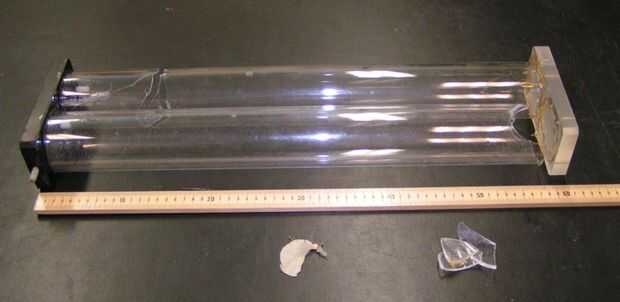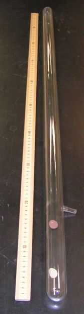 Hay unas cuantas fotos de las variaciones de doble tubo en línea en otras universidades, pero que yo sepa, no están comercialmente disponibles. Se utilizó el aparato de doble tubo abajo hasta que se cayó de la mesa y se convirtió en una demostración del mismo principio exacto sólo una vez. Los dos problemas con el viejo aparato de doble tubo fueron: (1) la longitud del tubo acortado no permitió un largo tiempo de caída, y (2) es imposible sustituir el objeto ligero (secado para arriba y disentigrating cinta adhesiva).